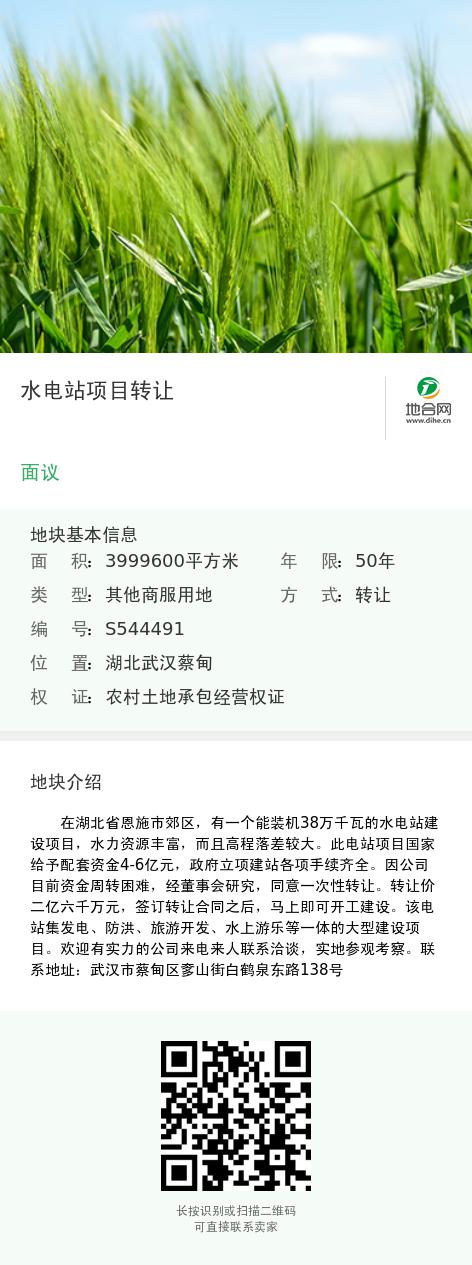 在湖北省恩施市郊区,有一个能装机38万千瓦的水电站建设项目,水力资源丰富,而且高程落差较大。此电站项目国家给予配套资金4-6亿元,政府立项建站各项手续齐全。因公司目前资金周转困难,经董事会研究,同意一次性转让。转让价二亿六千万元,签订转让合同之后,马上即可开工建设。该电站集发电、防洪、旅游开发、水上游乐等一体的大型建设项目。欢迎有实力的公司来电来人联系洽谈,实地参观考察。联系地址:武汉市蔡甸区奓山街白鹤泉东路138号